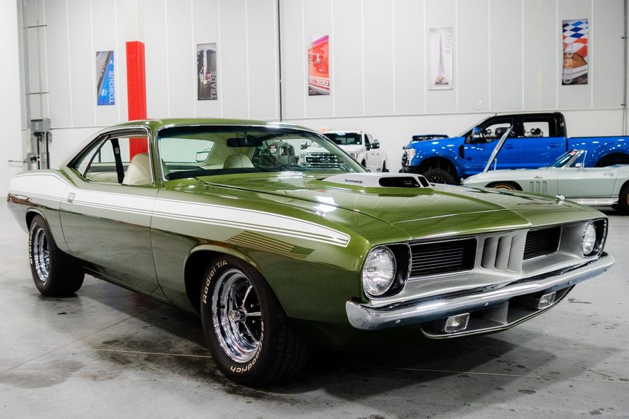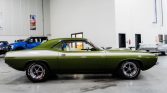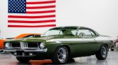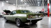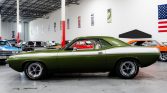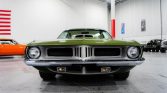 This Barracuda is a complete rebuild to original except for the engine. It is a head turner sitting in Amber Sherwood Green with white interior. With the correct markings this Barracuda looks like it just rolled out of the dealership today. This ‘Cuda Tribute is powered by a strong 340 engine. The transmission is a 727 transmission. Some of the great features include: power steering, power brakes, air conditioning, ceramic coated headers, dual exhaust, fiberglass hood with a Shaker style scoop, factory bucket seats, console and slap shifter, BF Goodrich tires mounted on Magnum chrome wheels, and a Kenwood stereo. This beauty has been restored from top to bottom and looks just perfect.